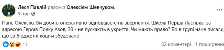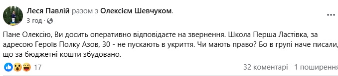 "Школа "Перша Ластівка", за адресою Героїв Полку Азов, 30 — не пускають в укриття. Чи мають право? Бо в групі наче писали, що за бюджетні кошти збудовано", — поставила питання одна із мешканок району.