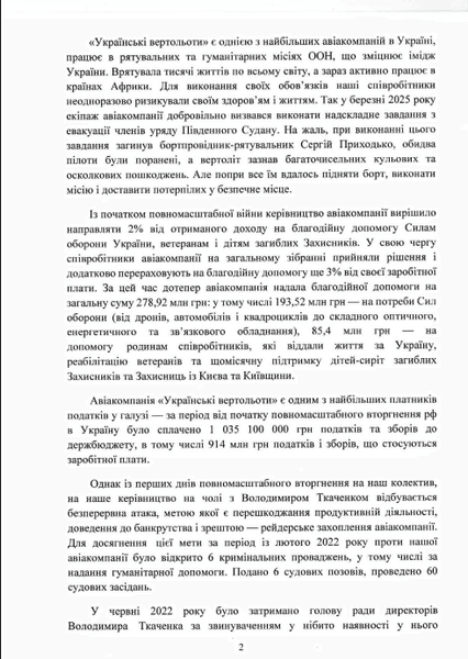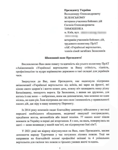 Ветерани та військові, які регулярно отримують допомогу від авіакомпанії "Українські вертольоти", родичі загиблих захисників, а також трудовий колектив цього підприємства спільно звернулися до президента із відкритим листом, пише видання "Главком".