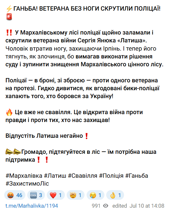 В Мархалівському лісі на Київщині стався конфлікт ветерана війни Сергія "Латиша" Янюка з представниками поліції. Місцеві пабліки повідомляють, що правоохоронці силою затримали ветерана з протезом, який протестував проти вирубки лісу для побудови Національного військового кладовища.