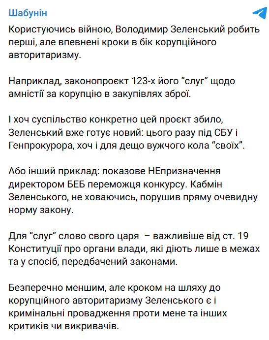 "Користуючись війною, Володимир Зеленський робить перші, але впевнені кроки в бік корупційного авторитаризму", — написав Шабунін.