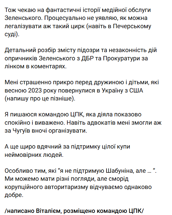 Команда ЦПК опублікувала написаний Віталієм Шабуніним текст у його Telegram-каналі 12 липня. Голова центру заявив, що обшуки проводилися без ухвали суду та тривали 15 годин, і під час них співробітники Служби безпеки України та Державного бюро розслідувань маніпулювали з його мобільним телефоном.