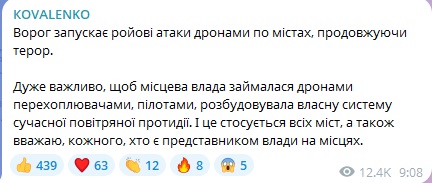 "Ворог запускає ройові атаки дронами по містах, продовжуючи терор. Дуже важливо, щоб місцева влада займалася дронами перехоплювачами, пілотами, розбудовувала власну систему сучасної повітряної протидії. І це стосується всіх міст, а також вважаю, кожного, хто є представником влади на місцях", — написав Коваленко.