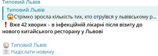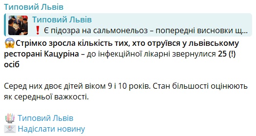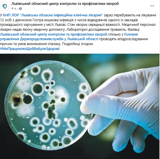Своєю чергою Львівський обласний центр контролю та профілактики хвороб повідомив, що в обласній інфекційній лікарні перебувають 12 осіб із діагнозом "гостра кишкова інфекція". Усі вони відвідували один із закладів громадського харчування у Львові.