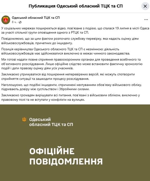 В Одеському обласному ТЦК і СП заявили, що їхня позиція незмінна: діяльність військовослужбовців має здійснюватися виключно в межах чинного законодавства. Про це йдеться на Facebook-сторінці відомства.