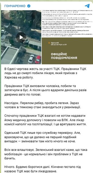 "Працівники ТЦК виловили чоловіка, побили і затягли в бус. А після цього вдарили кілька разів дверима автомобіля по голові. Слідство. Перелом ребер, пробита легеня. Зараз чоловік перебуває в реанімації. Спочатку працівники ТЦК узагалі не хотіли надавати йому медичну допомогу і відвезли на ВЛК. Але лікар комісії наполіг на госпіталізації. І це врятувало життя", — пише Гончаренко.