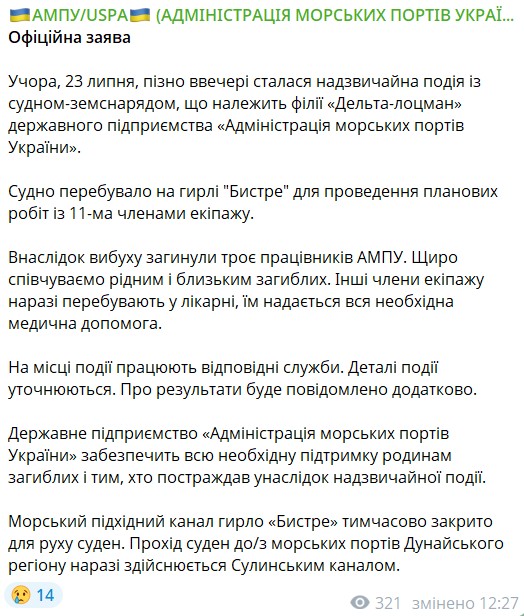 Вибух стався увечері 23 липня, написала в Telegram-каналі пресслужба державного підприємства "Адміністрації морських портів". Назви постраждалого судна-земснаряда немає, але вказано, що воно належить компанії "Дельта-лоцман". Адміністрація висловила слова співчуття родинам загиблих та повідомила, що інші члени екіпажу отримали поранення та перебувають у лікарні.