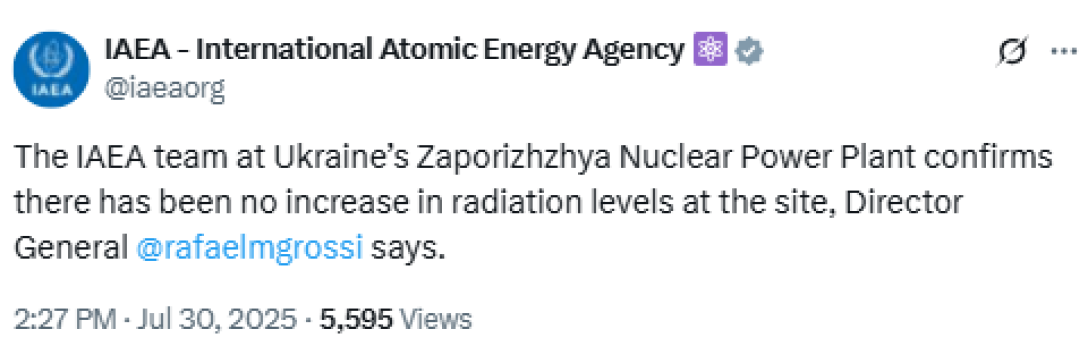 "Група МАГАТЕ на Запорізькій АЕС (Україна) підтвердила відсутність підвищення рівня радіації на об'єкті", — ідеться в повідомленні.
