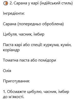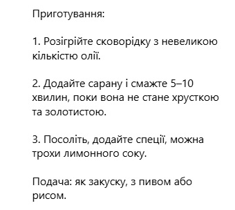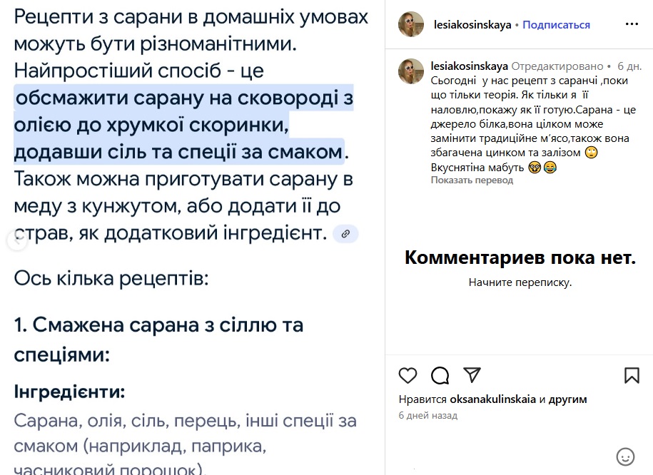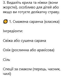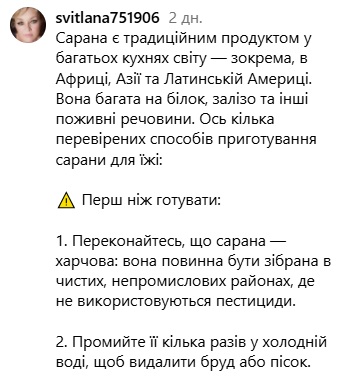 Ще одна сфера застосування сарани — кулінарія. У соцмережах уже багато рецептів, де блогери показують, як її готувати, стверджуючи, що це дуже швидко і дуже смачно.
