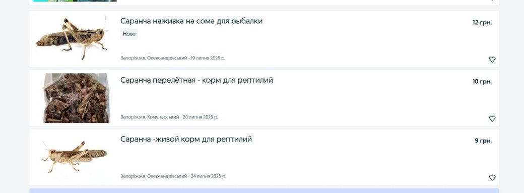 Один із продавців, які дали таке оголошення, розповів журналістам, що власноруч наловив комах у Запоріжжі. Він продає сарану по 12 гривень і готовий оперативно відправити її замовнику.