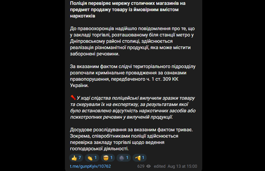 За інформацією поліції Київщини, до правоохоронців надійшло повідомлення про магазин біля станції метро у Дніпровському районі, де продавали продукцію з можливим вмістом заборонених речовин. За цим фактом розпочали кримінальне провадження за ч. 1 ст. 309 КК України.