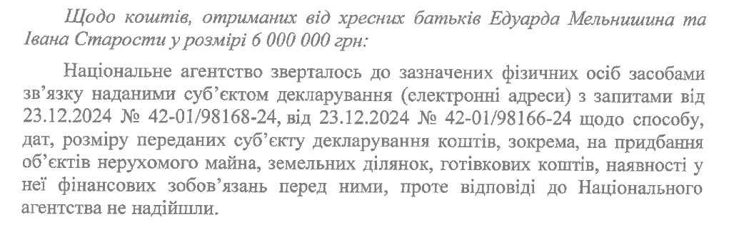 "Слід зазначити, що колишній чоловік суб'єкта декларування — Роланд Цебер у період з 2011 по 2022 роки отримав 375 тис. грн доходу. Зазначені обставини свідчать про неможливість суб'єкта декларування накопичити грошовий актив у зазначеному розмірі", — йдеться у довідці НАЗК.