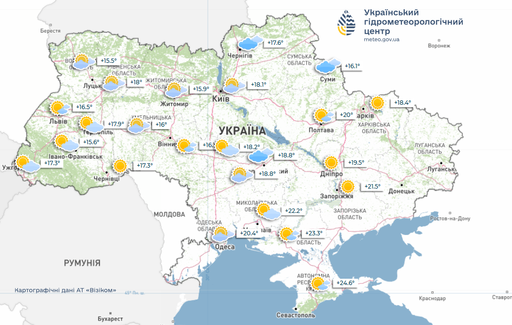 Жителі західних областей можуть сподіватися на більшу свіжість — там прогнозується +20…+24, а на Закарпатті близько +26.