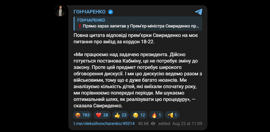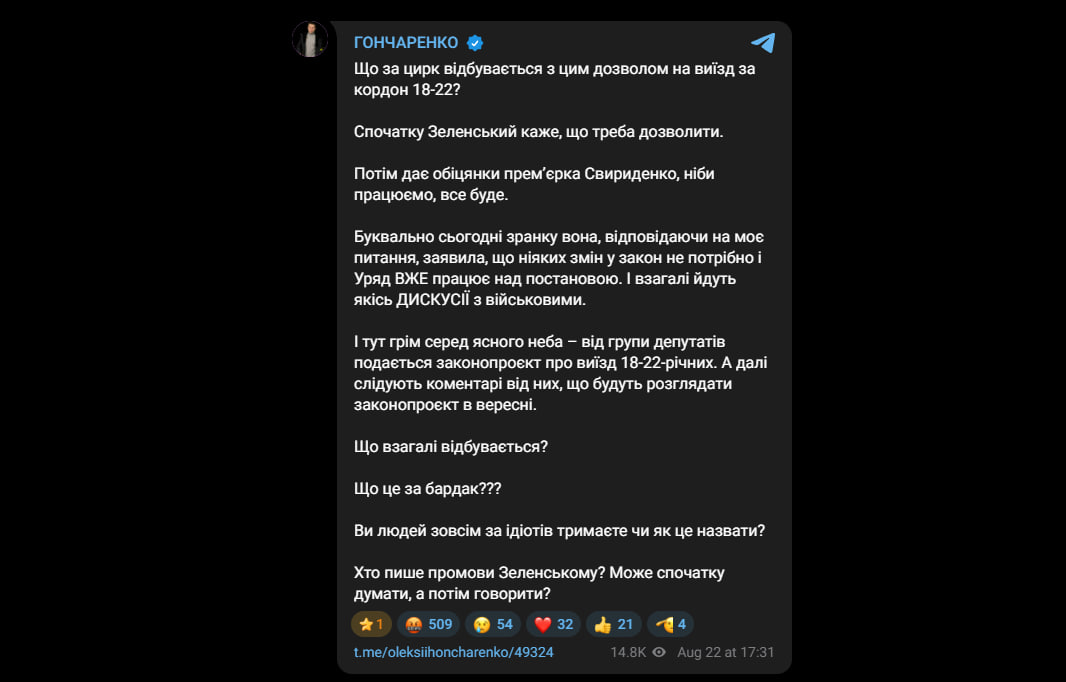 Також у своєму телеграм-каналі він звернув увагу на плутанину, яка виникла навколо цього питання. Він зазначив, що спочатку президент озвучив ідею дозволити виїзд молодим чоловікам, після чого прем’єрка заявила про підготовку постанови уряду, а згодом у парламенті з’явився окремий законопроєкт. Гончаренко розкритикував таку ситуацію та назвав її "бардаком".
