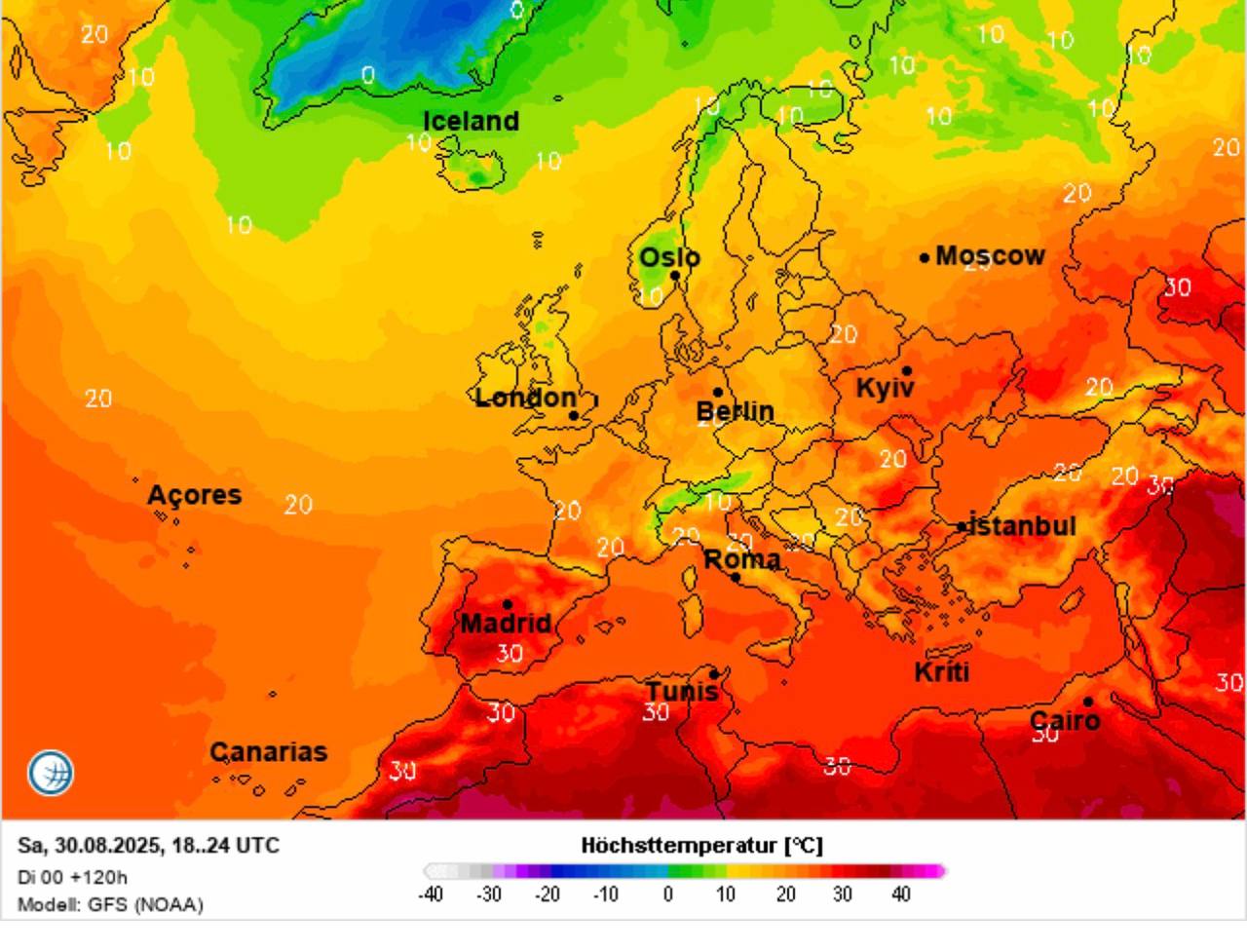 Карта прогнозу погоди на суботу, 30 серпня, показує, що Україна завершить літо як одна з найспекотніших країн Європи.