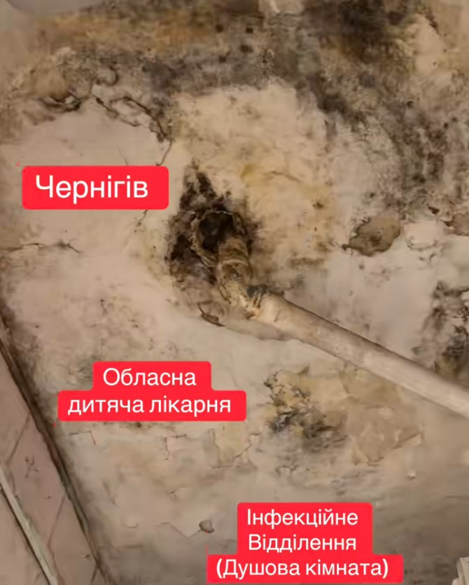 "Кругом пліснява, чорна, і очевидно що вона там давно, стеля це взагалі…, вся мокра в ній стирчіть труба з якої тече більше ніж з самого душа, труба та вся іржава, трухлява… І це все дитяче інфекційне відділення!" — написала жінка в описі до відео.