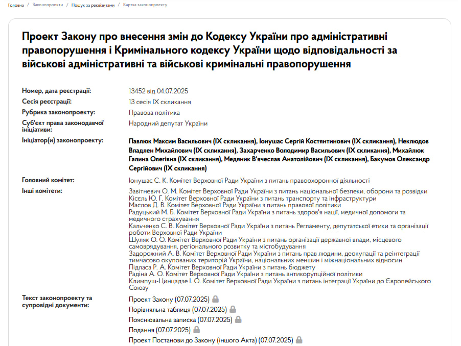 За інформацією з сайту Верховної Ради, ініціаторами законопроєкту виступили Максим Павлюк, Сергій Іонушас, Владлен Неклюдов, Володимир Захарченко, Галина Михайлюк, В’ячеслав Медяник та Олександр Бакумов. Документ спрямований на вдосконалення механізмів застосування адміністративних та кримінальних стягнень до військових, зокрема щодо правопорушень, що виникають під час служби, зборів або у бойовій обстановці.