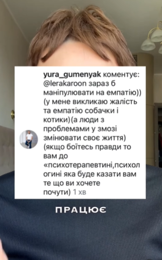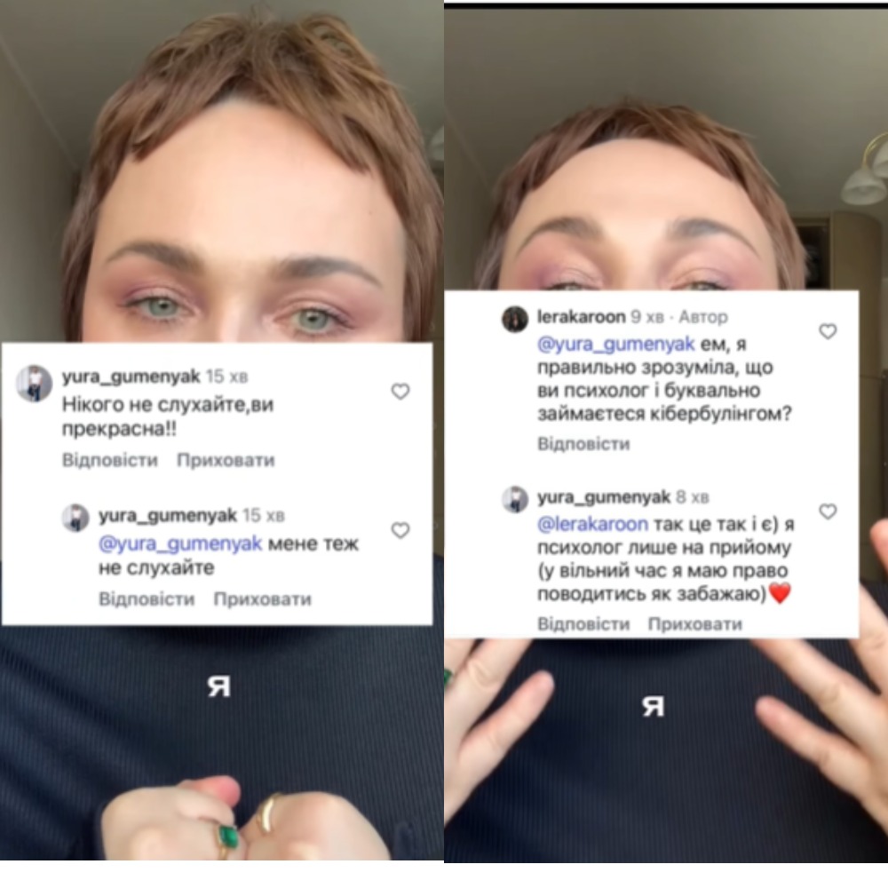 На відеоролику продемонстровано скриншоти коментарів, які залишав львівський психолог під її дописами. Дівчина також розповіла, що тривалий час лікує клінічну депресію, тому такі коментарі для неї неприйнятні.