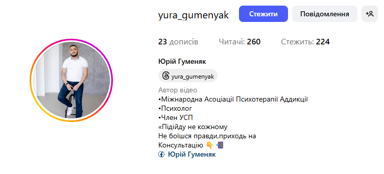 На сторінці Гуменяка в Instagram пише, що він психолог, член Міжнародної асоціації психотерапії аддикції. Психолог також закликає не боятися приходити до нього на консультації.