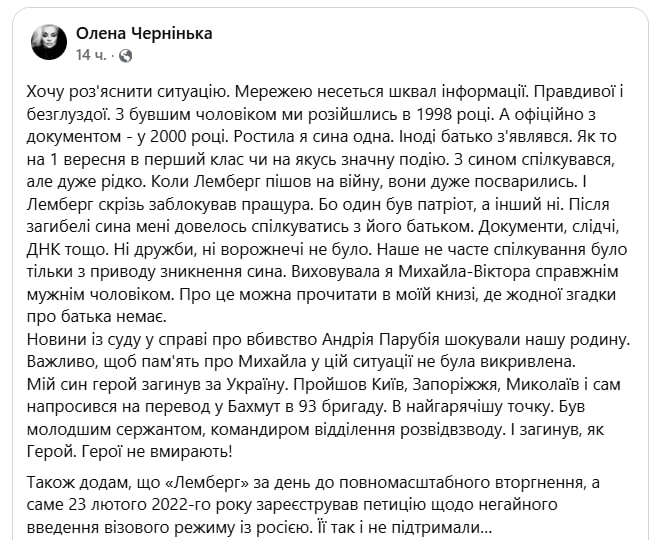 Зокрема, мати загиблого, Олена Чернінька, на своїй сторінці у Facebook пояснила, що батько хлопця не брав участі у його вихованні. Вона зазначила, що вони розійшлись у 1998 році, офіційно — у 2000-му, і Михайла-Віктора вона виховувала самостійно. За словами матері, батько іноді з’являвся на свята, однак їхні стосунки залишалися формальними, особливо після того, як син пішов на війну та посварився з батьком через різні погляди на патріотизм. Окрім цього, після загибелі сина спілкування з батьком обмежувалося лише документальними та слідчими питаннями, і пам’ять про "Лемберга" не повинна викривлятись.