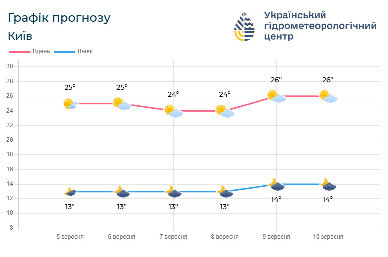 За графіком прогнозу Українського гідрометеорологічного центру, на вихідних у Києві очікується комфортна погода: вдень температура становитиме +24…+26 градусів, а вночі зберігатиметься прохолода на рівні +13…+14 градусів. Суттєвих опадів не прогнозується, тож столичні жителі зможуть насолодитися сонячними днями та приємними вечорами.