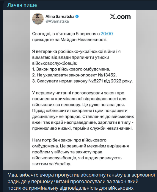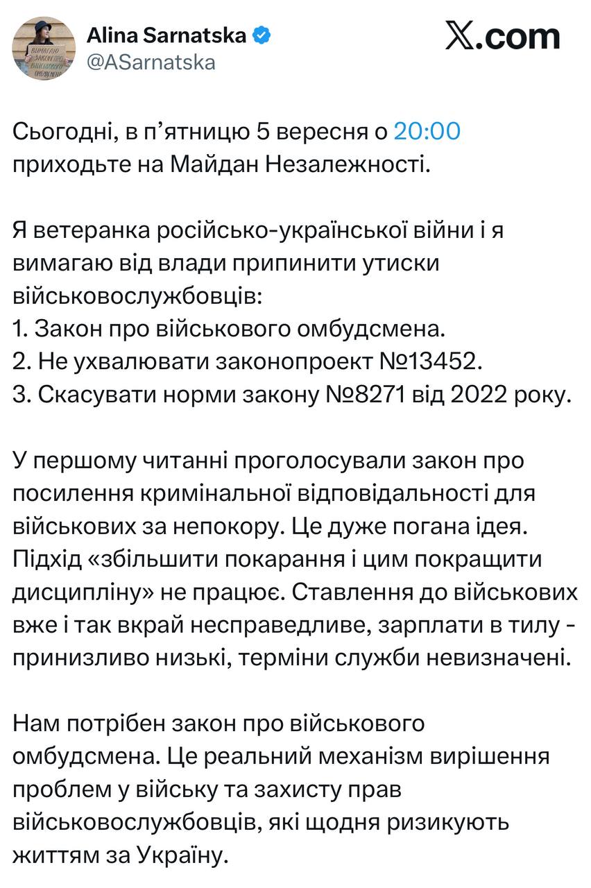 Сьогодні, 5 вересня, у Києві о 20:00 відбудеться нова акція протесту на Майдані Незалежності, повідомила ветеранка і громадська діячка Аліна Сарнацька. У своїх дописах у соцмережах вона закликала українців прийти на Майдан і вимагати припинення утисків військовослужбовців.