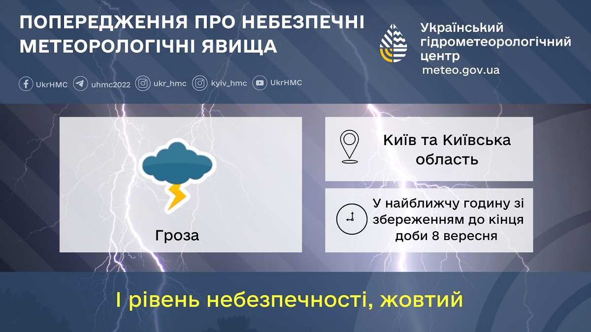В Гідрометцентрі повідомили, що 8-13 вересня на Київщині та в місті Києві погоду зумовлюватиме поле високого атмосферного тиску, тому загалом опадів очікувалось. Але 9 вересня, за рахунок особливості погодних процесів над територією України на висотах, місцями є ймовірність дощів літнього характеру: це значить короткочасних за тривалістю, різних за інтенсивністю — від невеликих до помірних, з нерівномірним розподілом по території, вдень подекуди з грозою.
