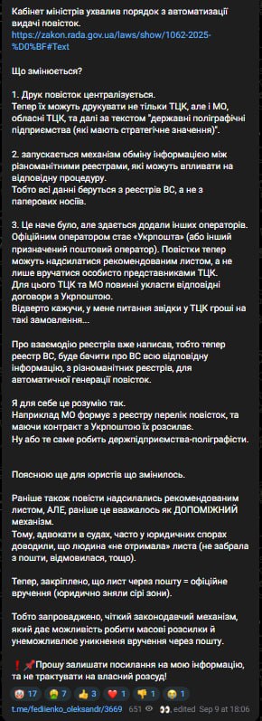 Повістки і раніше надсилались рекомендованим листом, але це було лише допоміжним механізмом, пояснює у своєму Telegram-каналі народний депутат Олександр Федієнко. Це давало можливість довести в суді, що людина "не отримала" листа (не забрала з пошти, відмовилася від отримання тощо).