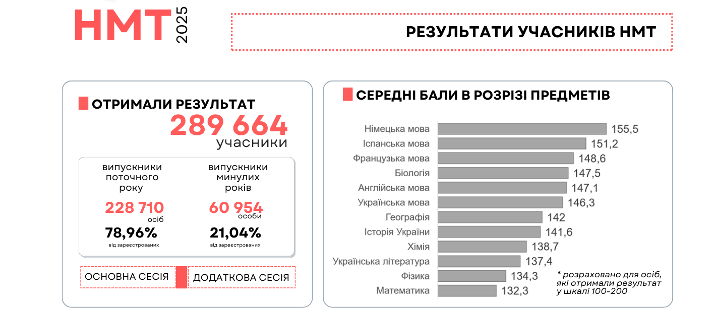 Учасники Національного мультипредметного тесту (НМТ) у 2025 році, які обрали німецьку мову, показали найвищий середній результат — 155,5 бала. Водночас найнижчий показник продемонстрували ті, хто складав завдання з математики — 132,3.