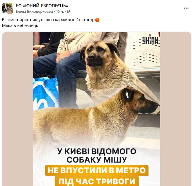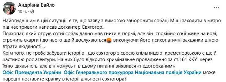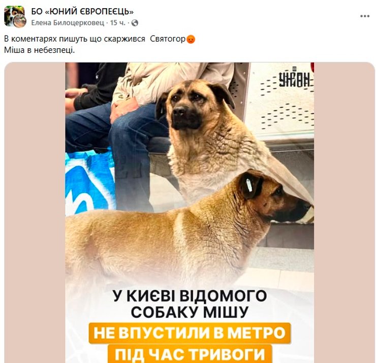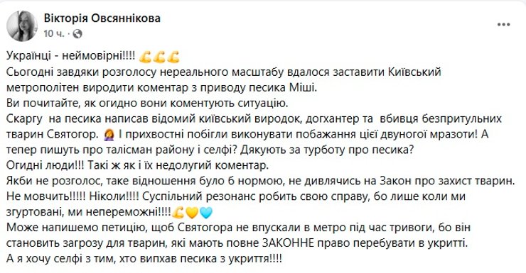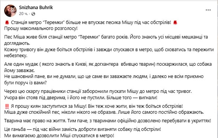 "Але один мудак (якого знають у Києві, як догхантера вбивцю тварин) поскаржився, що собака йому заважає. Нешановний пане, ви не думали, що це саме ви заважаєте людям, і далеко не всім приємно бути поруч із вами? Через цю скаргу працівники станції заборонили пускати Мішу в метро під час тривог. Учора він стояв біля дверей, і його не пустили. Ба більше — вигнали!" — написала вона і зажадала від співробітників метрополітену дозволити тварині знову бути в безпеці.