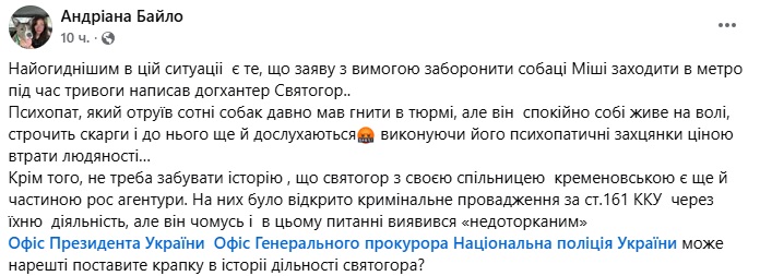 "Найогиднішим у цій ситуації є те, що заяву з вимогою заборонити собаці Михайла заходити в метро під час тривоги написав догхантер Святогор. Психопат, який отруїв сотні собак, давно мав би гнити у в'язниці, але він спокійно собі живе на волі, строчить скарги, і до нього ще й прислухаються!"