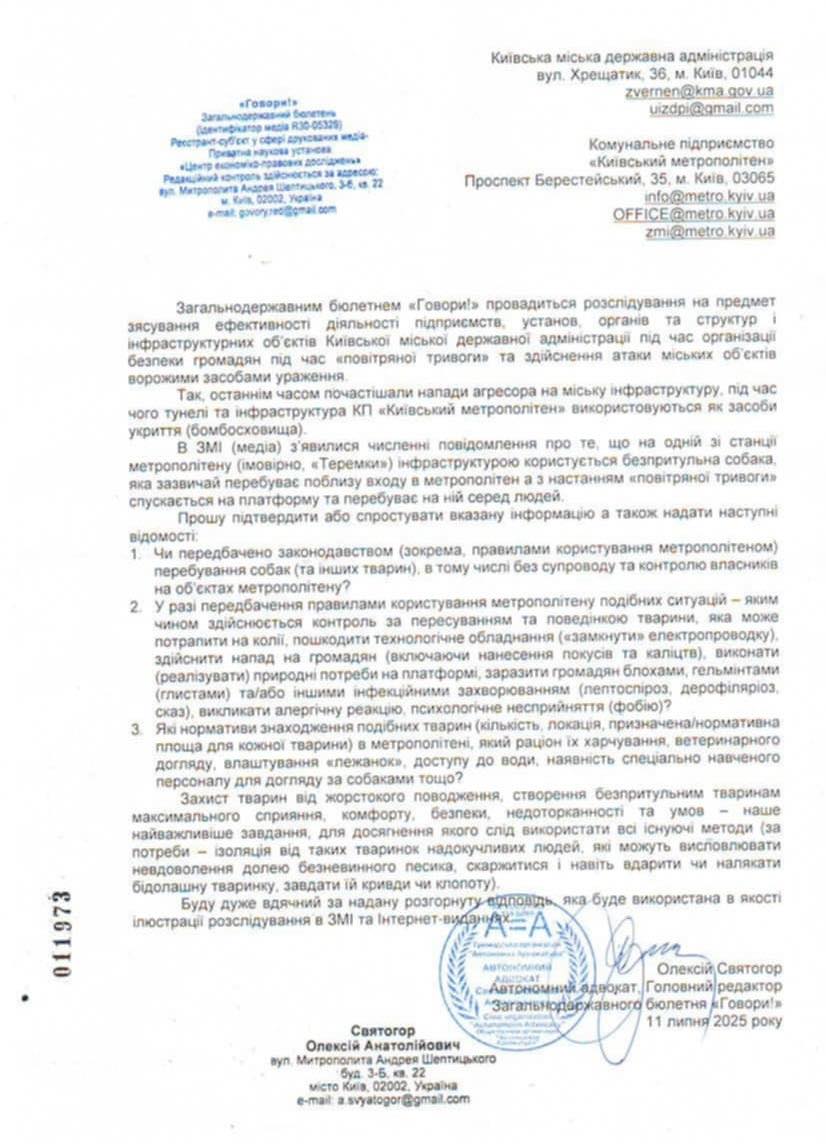 Ця ситуація збурила користувачів соцмереж і викликала резонанс. Люди вимагали пояснень і наполягали на тому, що собака має таке саме право на захист, як і люди. У КП "Київський метрополітен" відреагували на скандал.