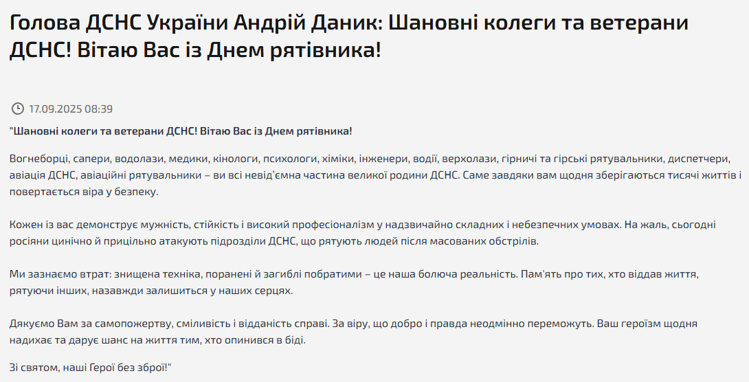 Голова Державної служби України з надзвичайних ситуацій Андрій Даник привітав колег зі святом.