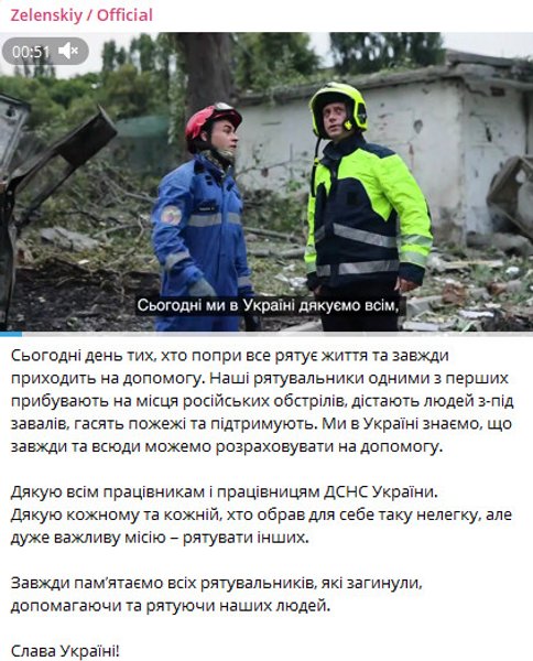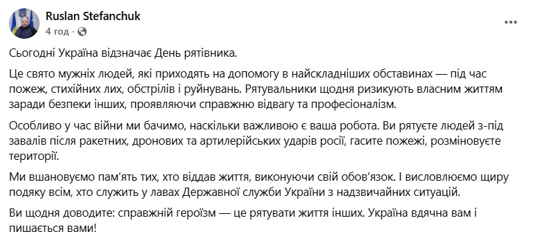 "З Днем рятівника! Ви — Герої без зброї, які щодня зберігають тисячі життів", — наголосив він.