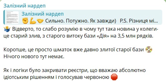 Це "старий" витік бази "Дія" на 3,5 млн рядків, стверджує народний депутат від партії "Голос" Ярослав Железняк.
