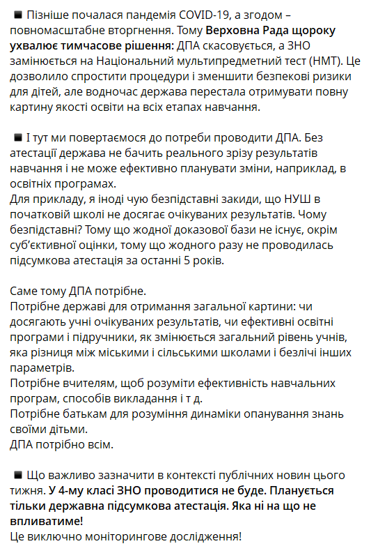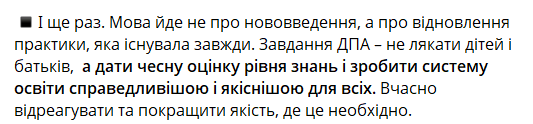 "Мова йде не про нововведення, а про відновлення практики, яка існувала завжди. Завдання ДПА – не лякати дітей і батьків, а дати чесну оцінку рівня знань і зробити систему освіти справедливішою і якіснішою для всіх. Вчасно відреагувати та покращити якість, де це необхідно", — зазначив народний обранець.