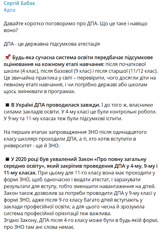 У 2020 році в Україні був ухвалений Закон "Про повну загальну середню освіту", який закріпив проведення ДПА у 4-му, 9-му і 11-му класах, але для випускників "іспити" повинні проходити у формі ЗНО, щоб і видати атестат, і отримати результати для вступу дітей у ВНЗ, пише голова комітету ВРУ з питань освіти Сергій Бабак.
