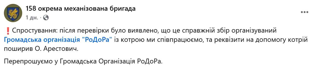 158-ма окрема механізована бригада повідомила про спростування попередньої інформації щодо нібито фейкового збору коштів, пов’язаного з Олексієм Арестовичем. Після перевірки встановлено, що допомогу справді організовує Громадська організація "РоДоРа", з якою підрозділ співпрацює.