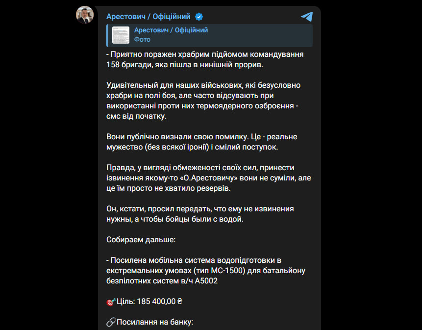 "Щоправда, через обмеженість своїх сил, вибачитися перед якимось "О.Арестовичем" вони не зуміли, але це їм просто не вистачило резервів. Він, до речі, просив передати, що йому не вибачення потрібні, а щоби бійці були з водою", — написав Арестович.