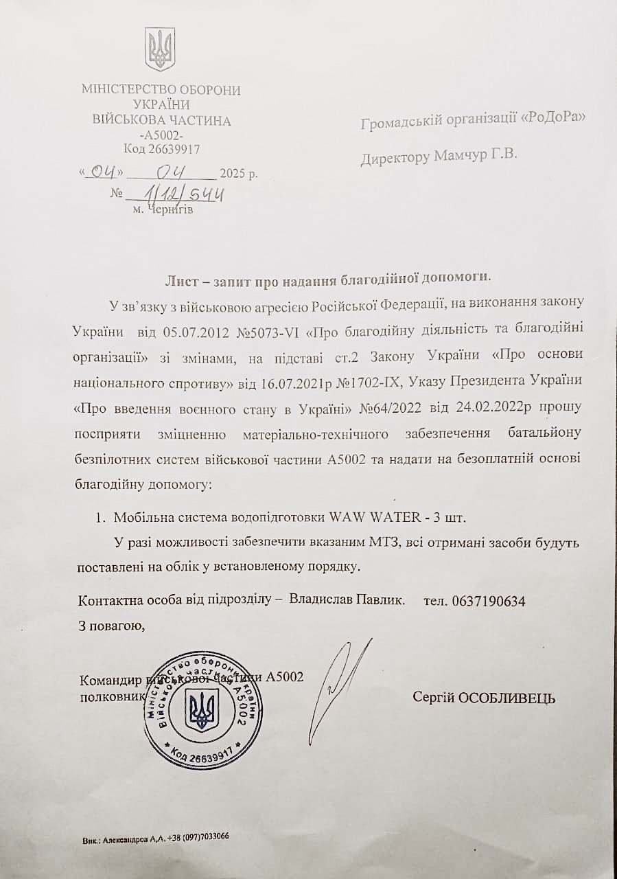"Ми закликаємо зберігати довіру, перевіряти джерела інформації та об’єднувати зусилля задля спільної мети — підтримки наших захисників. Якщо в/ч А5002 більше не потребує трьох систем очищення води, ми відкриті до отримання офіційного листа-відмови, щоб перенаправити зібрані кошти на потреби інших частин", — йдеться в дописі.