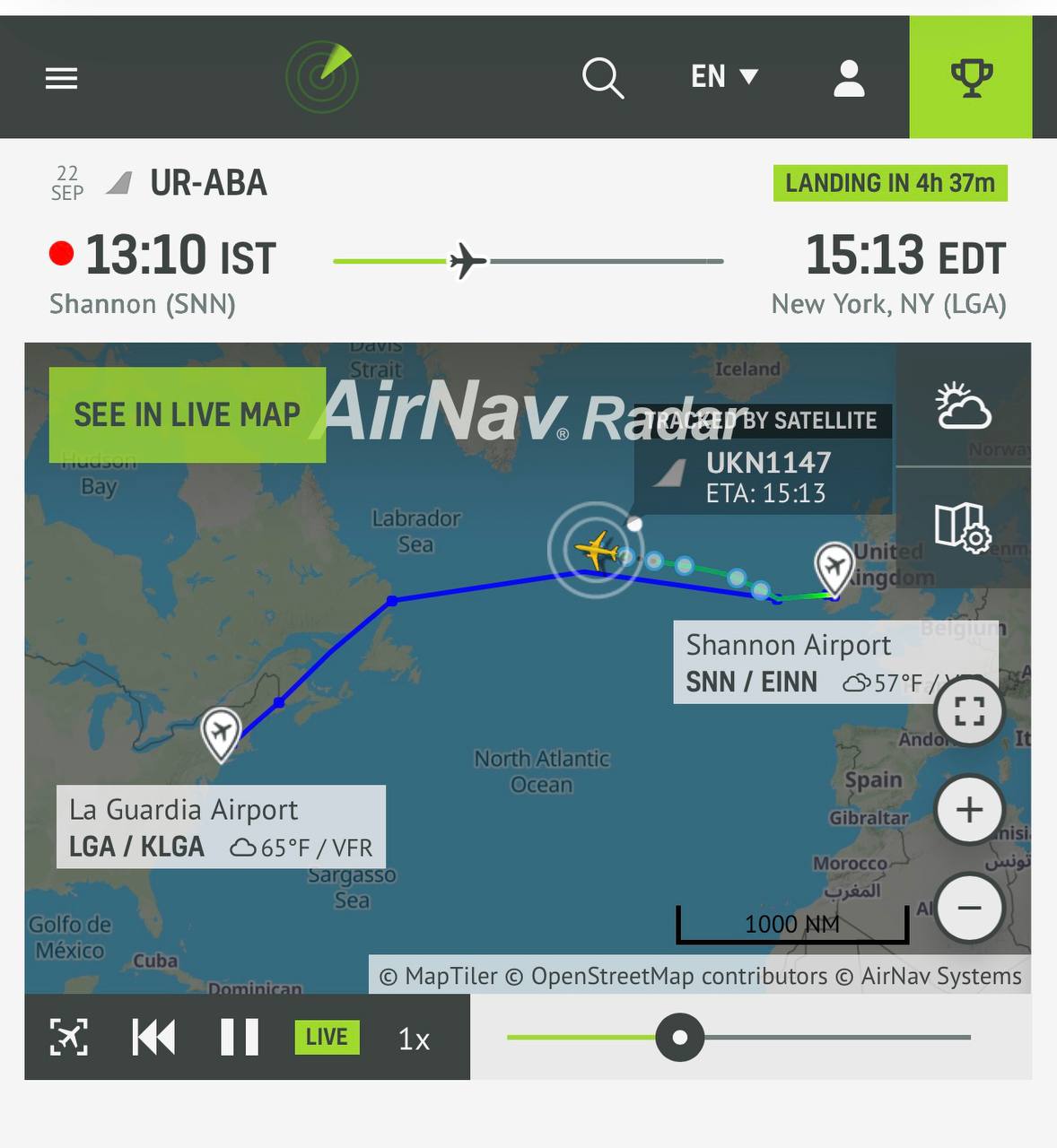 За інформацією з відкритих джерел, рейс UR-ABA був зафіксований на сервісі AirNav Radar. На карті видно, що літак вирушив з аеропорту Shannon (SNN) о 13:10 за місцевим часом і має прибути до аеропорту LaGuardia (LGA) у Нью-Йорку о 15:13 за східноамериканським часом. Маршрут проходить через Атлантичний океан, а орієнтовний час польоту становить понад 7 годин. На момент публікації залишалося близько 4 годин 37 хвилин до прибуття.