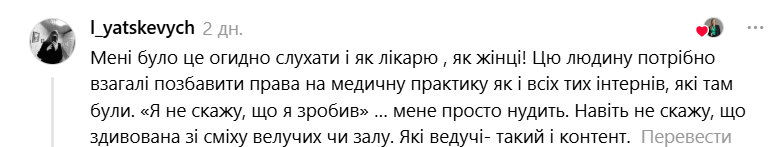 Під час шоу "Медичні історії" один із запрошених гостей розповів, як ще бувши інтерном, як він разом із колегами-чоловіками розглядали пацієнтку, що перебувала на операційному столі. Після хвилі обурення скандальний фрагмент з програми вирізали.