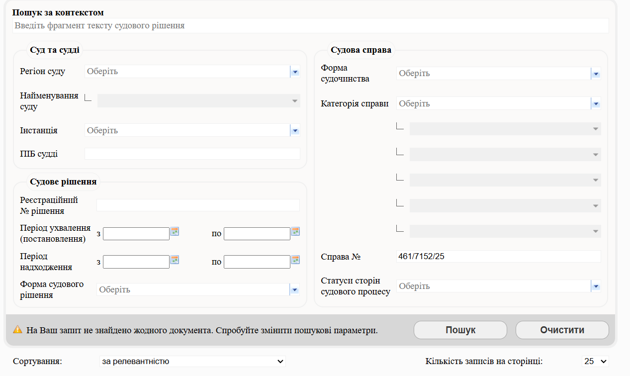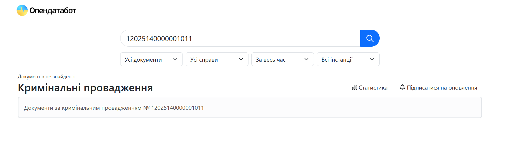 На запит за кримінальним провадженням № 12025140000001011 чи у справі № 461/7152/25 на сайтах "Опендатабот" і "Єдиний державний реєстр судових рішень" не знаходяться жодні матеріали.