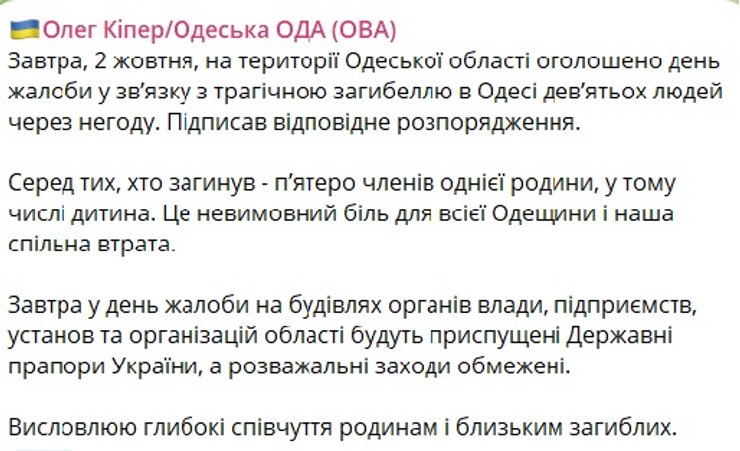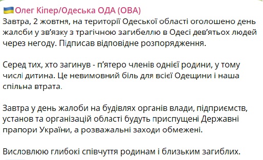 2 жовтня голова Одеської обласної військової адміністрації Олег Кіпер оголосив днем жалоби.