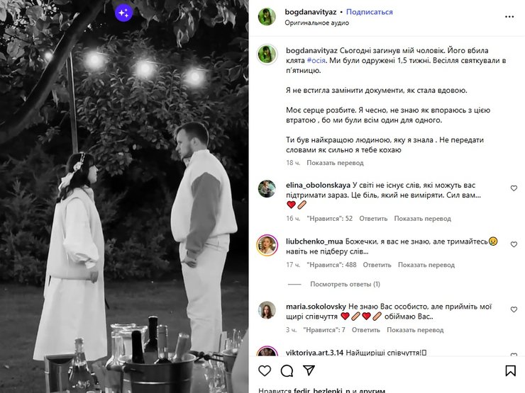 "Сьогодні загинув мій чоловік. Його вбила проклята #осія. Ми були одружені 1,5 тижні. Весілля святкували в п'ятницю. Я не встигла замінити документи, як стала вдовою. Моє серце розбите. Я чесно не знаю, як впораюся з цією втратою, тому що ми були всім одне для одного. Ти був найкращою людиною, яку я знала. Не передати словами, як сильно я тебе люблю", — написала дівчина, опублікувавши кадри з весілля.
