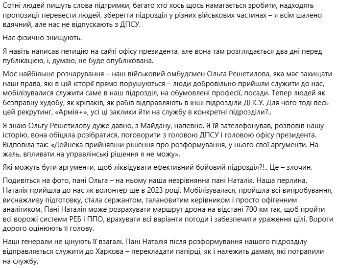 Військовий підкреслює, що він намагався захистити права своїх підопічних, однак не зміг нічого вдіяти. Тому не розуміє, чому керівництво ДПСУ вирішило "ліквідувати ефективний бойовий підрозділ", називаючи таке рішення "злочином".