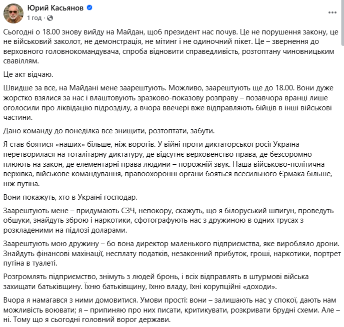 "Президент не чує. Я знову вийду на Майдан сьогодні о 18.00. Це не політичний протест. Це – військова необхідність. Нам треба зберегти ефективний підрозділ, який став жертвою генеральського недоумства і "політичної" доцільності. Ми не бунтуємо, не мітингуємо, не висуваємо політичних вимог. Ми хочемо лише одного – воювати у складі підрозділу", — відзначив офіцер ЗСУ.