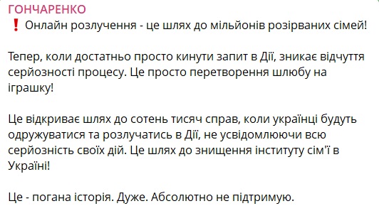 Водночас нардеп вважає такий крок уряду помилкою і категорично його не підтримує, називаючи розлучення онлайн шляхом до мільйонів розірваних сімей.
