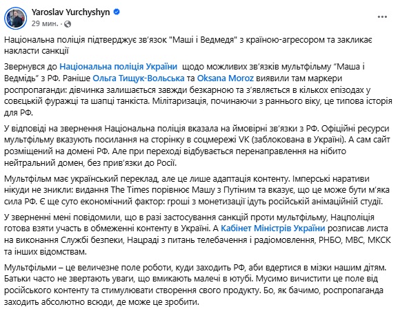 "Імперські наративи нікуди не зникли: видання The Times порівнює Машу з Путіним і вказує, що це може бути м'яка сила РФ. Є ще суто економічний фактор: гроші з монетизації йдуть російській анімаційній студії", — пояснює парламентарій.