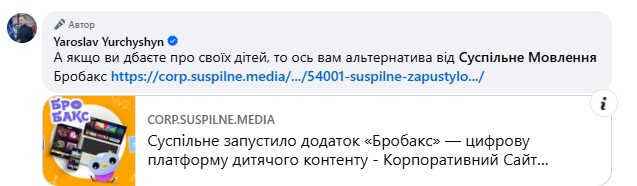 Як альтернативу контенту виробництва РФ Юрчишин пропонує застосунок "Бробакс" від "Суспільне Мовлення" — цифрову платформу дитячого контенту, де зібрано понад 250 годин дитячого контенту: мультсеріали та повнометражні мультики, пізнавальні дитячі шоу, мультфільми жестовою мовою і каталог аудіоказок.