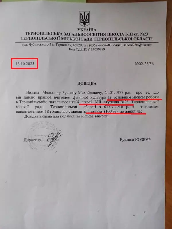Мати Руслана, Ольга Мельник, одразу звернулася до керівництва школи, де син працює. Директорка закладу Руслана Козбур підтвердила, що педагог офіційно обіймає посаду вчителя фізкультури на повну ставку та має чинну відстрочку до 5 листопада. Попри це, з номера Руслана директорці зателефонував невідомий чоловік, який представився працівником військової частини, і заявив, що "він не працює в школі".